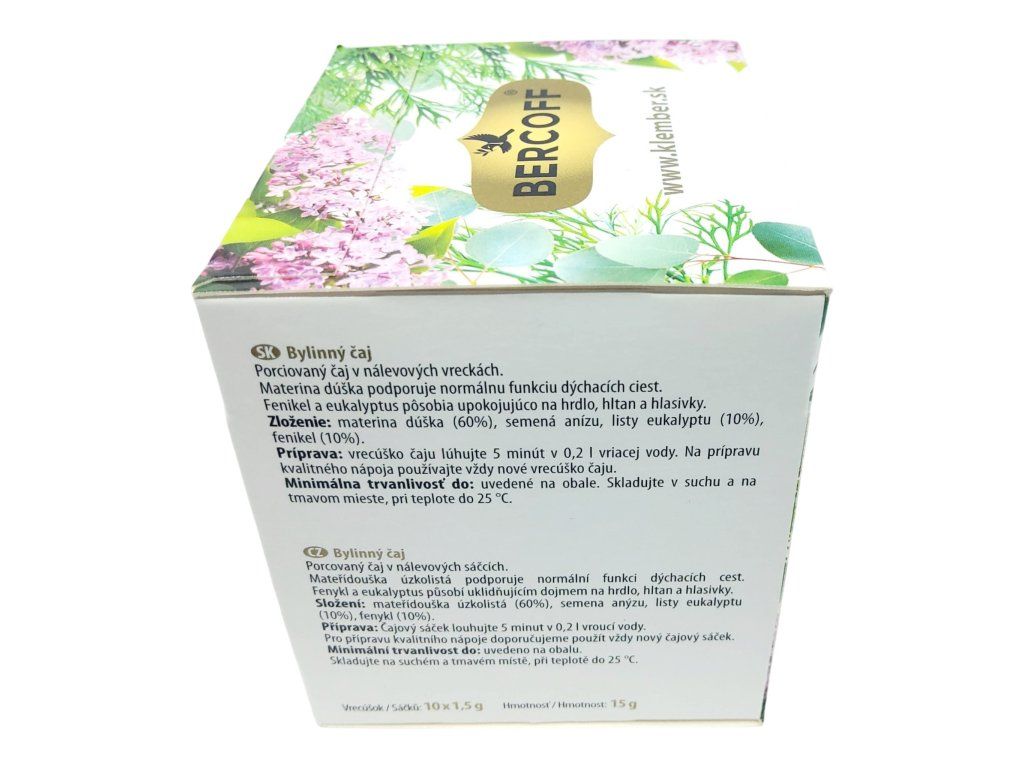 Složení: mateřídouška (60%), semena anýzu, listy eukalyptu (10%), fenykl (10%)