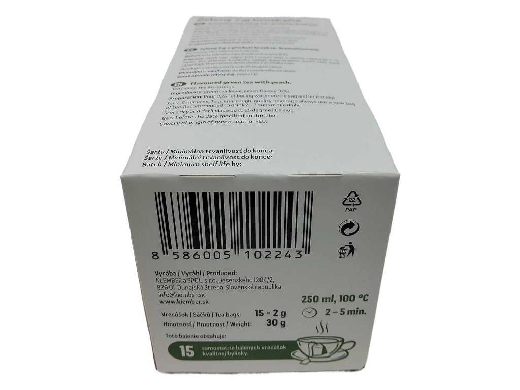 Složení: listy zeleného čaje, přírodní broskvové aroma (6%)