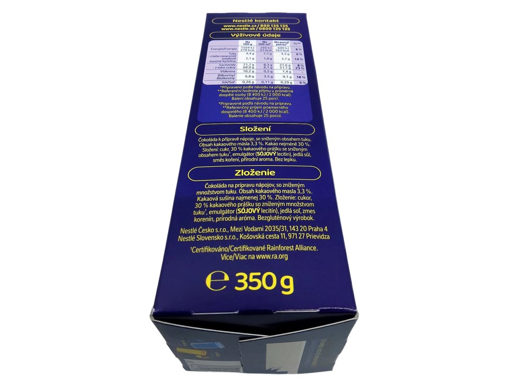 Složení: cukr, 30% kakaového prášku se sníženým množstvím tuku(1), emulgátor (sójový lecitin), jedlá sůl, směs koření, přírodní aroma