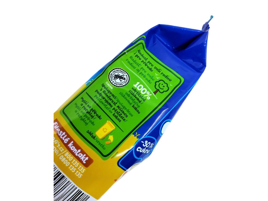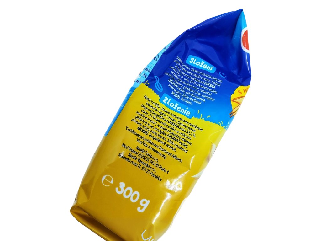 Složení: jemná celozrnná bezglutenová OVSENÁ mouka 32,2 %, cukr, 25 % kakaového prášku se sníženým množstvím tuku1, rozpustná kukuřičná vláknina, glukózový sirup, emulgátor (SOJOVÝ lecitin), přírodní aroma, mléko.
