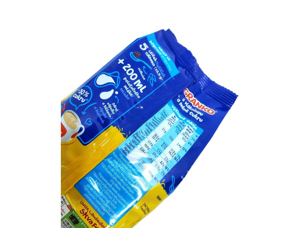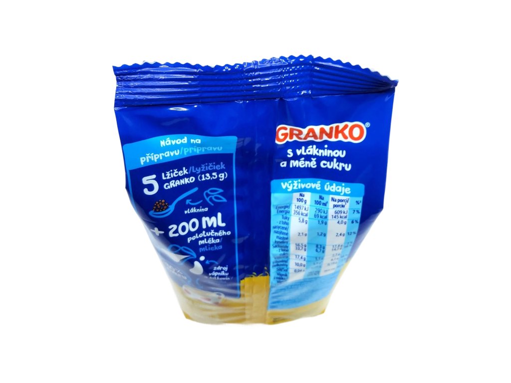 Příprava: 5 lžiček (13,5 g) Granku + 200 ml teplého nebo studeného polotučného mléka.