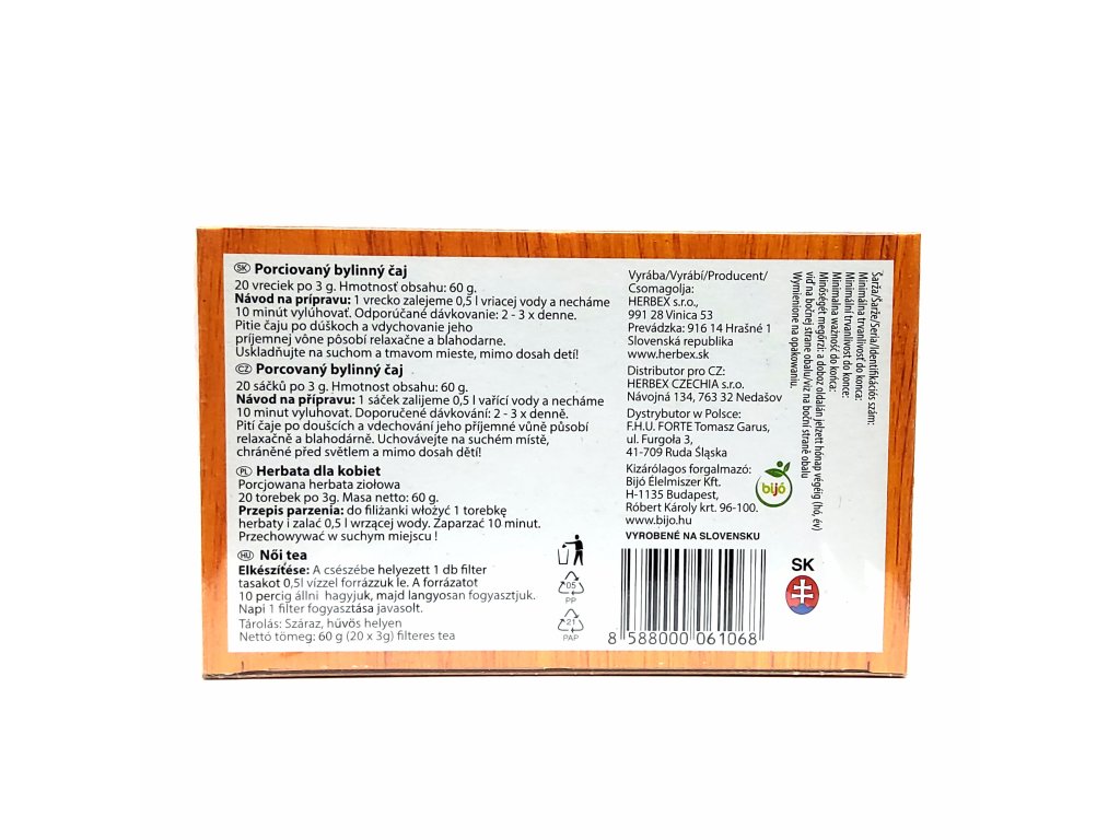Zloženie: materina dúška (vňať), medovka lekárska (vňať), alchemilka obecná (vňať), rebríček obyčajný (vňať), repík lekársky (vňať), ľubovník bodkovaný (vňať)