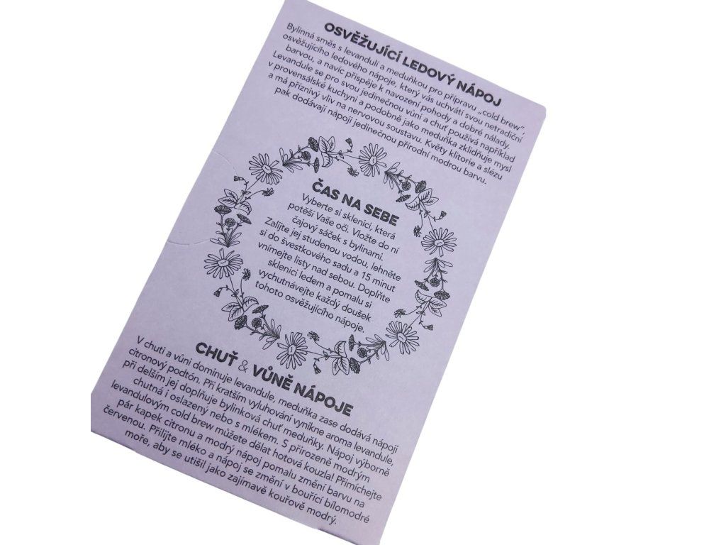 Hlavní roli v této kompozici hraje levandule – bylina známá svým nezaměnitelným aroma a jemně květinovou chutí, která si našla své místo nejen v bylinkářství, ale také v provensálské kuchyni. Spolu s ní působí meduňka, která dodává nápoji svěží citrusový podtón a zároveň podporuje uklidnění mysli a příznivě ovlivňuje nervovou soustavu. Tato dvojice vytváří harmonický základ, který je ideální pro chvíle oddechu, zpomalení a načerpání nové energie.