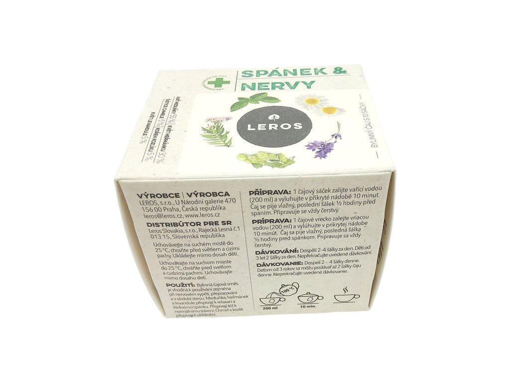 Bylinný čaj vyrobený ke zklidnění těla a mysli po náročném dni. Tento jemný čaj obsahuje pečlivě vybrané bylinky jako meduňku, levanduli a heřmánek, které jsou známé uklidňujícími a relaxačními účinky. Díky těmto přírodním složkám pomáhá nabýt kvalitní spánek a přispívá k celkové energii klidu nervové soustavy. Leros Spánek a nervy je ideálním společníkem před spaním – připravte si šálek, uvolněte se a dopřejte si chvíli pohody pro klidnější a hlubší spánek.