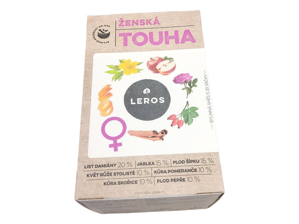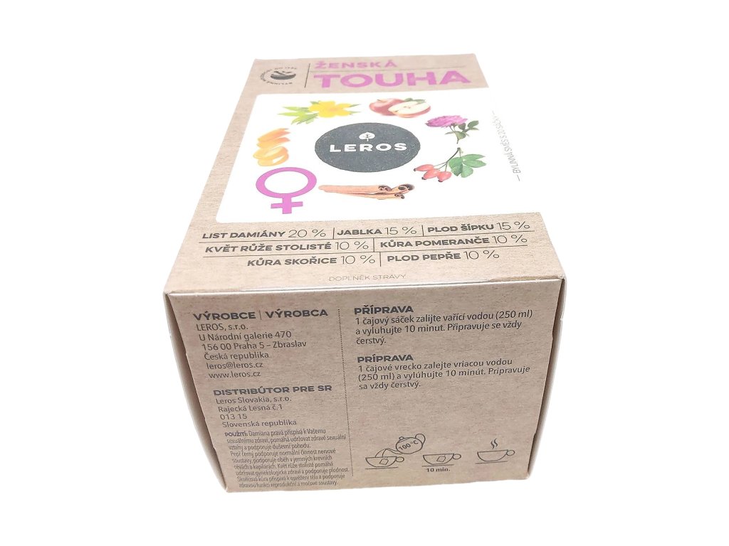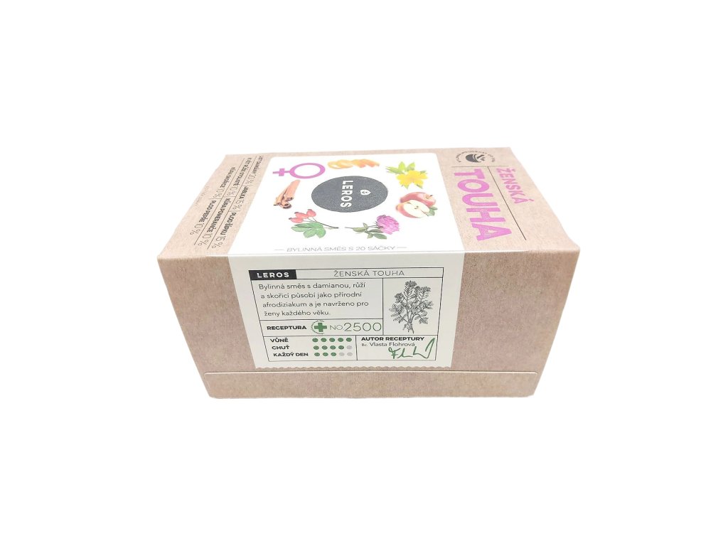 Tento čaj je ideální pro ženy, které hledají přírodní podporu pro své zdraví a pohodu, a může se pít pravidelně, např. každý den. Leros Ženská touha má jemnou a příjemnou chuť s bylinnými tóny, které oceníte zejména během odpočinku nebo relaxačních chvil.