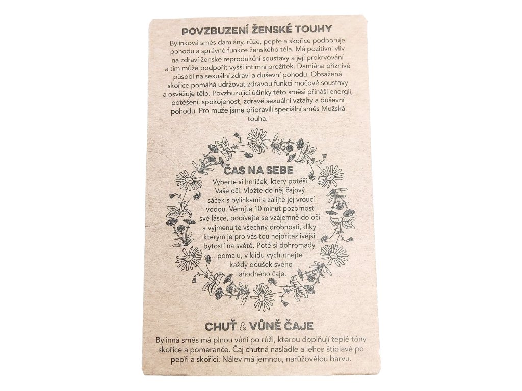 Bylinný čaj speciálně navržen pro podporu ženského zdraví a vitality. Tento čaj je oblíben pro své přírodní složení a pečlivě vybrané bylinky, které mají pozitivní vliv na zdraví ženské reprodukční soustavy a její prokrvování, vitalitu a celkovou pohodu. Složka čaje damián příznivě působí na sexuální zdraví a duševní pohodu.