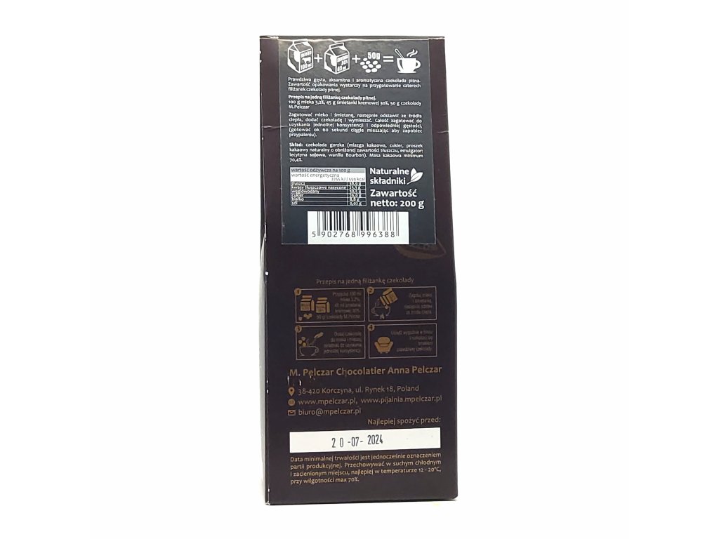 Složení: hořká čokoláda (kakaová hmota, cukr, nízkotučný kakaový prášek, emulgátor: sójový lecitin, Bourbon vanilka). Kakaová sušina minimálně 70,4 %.