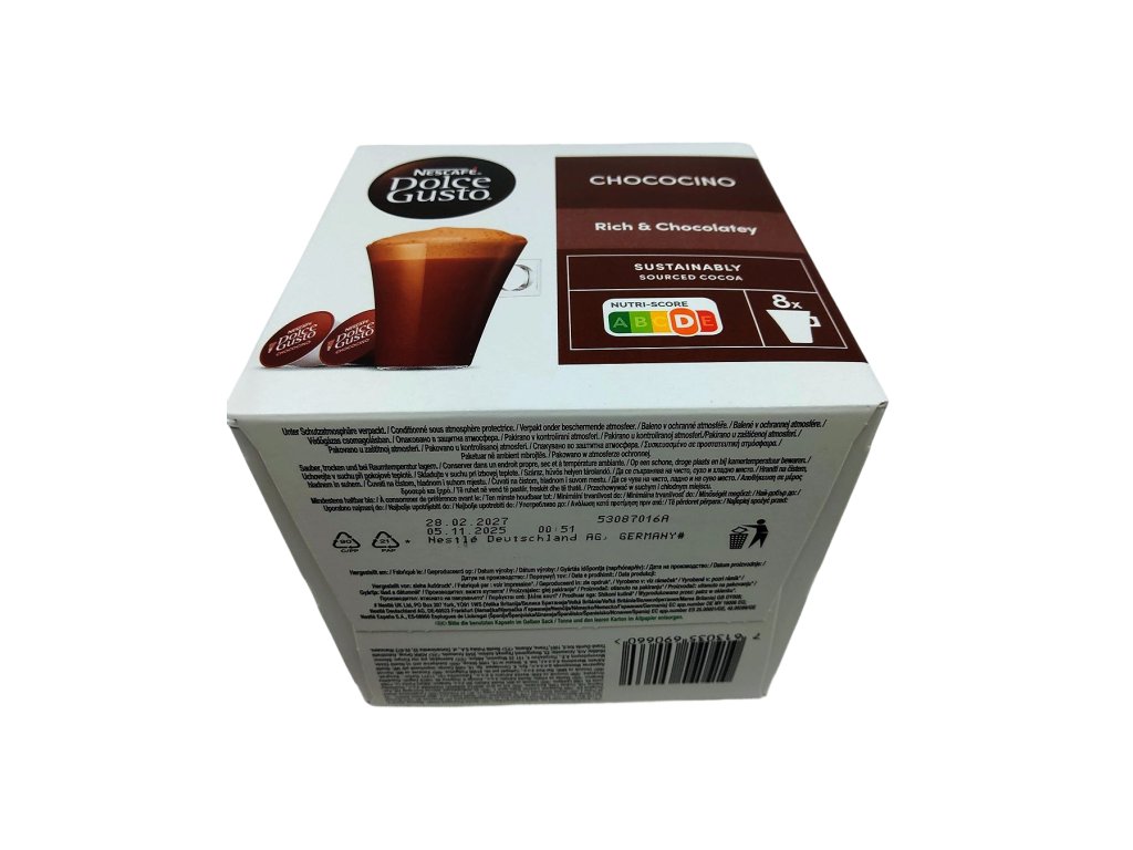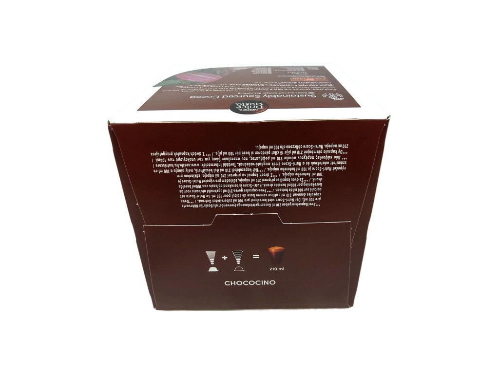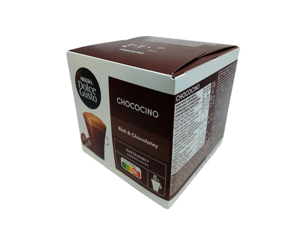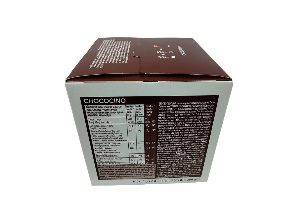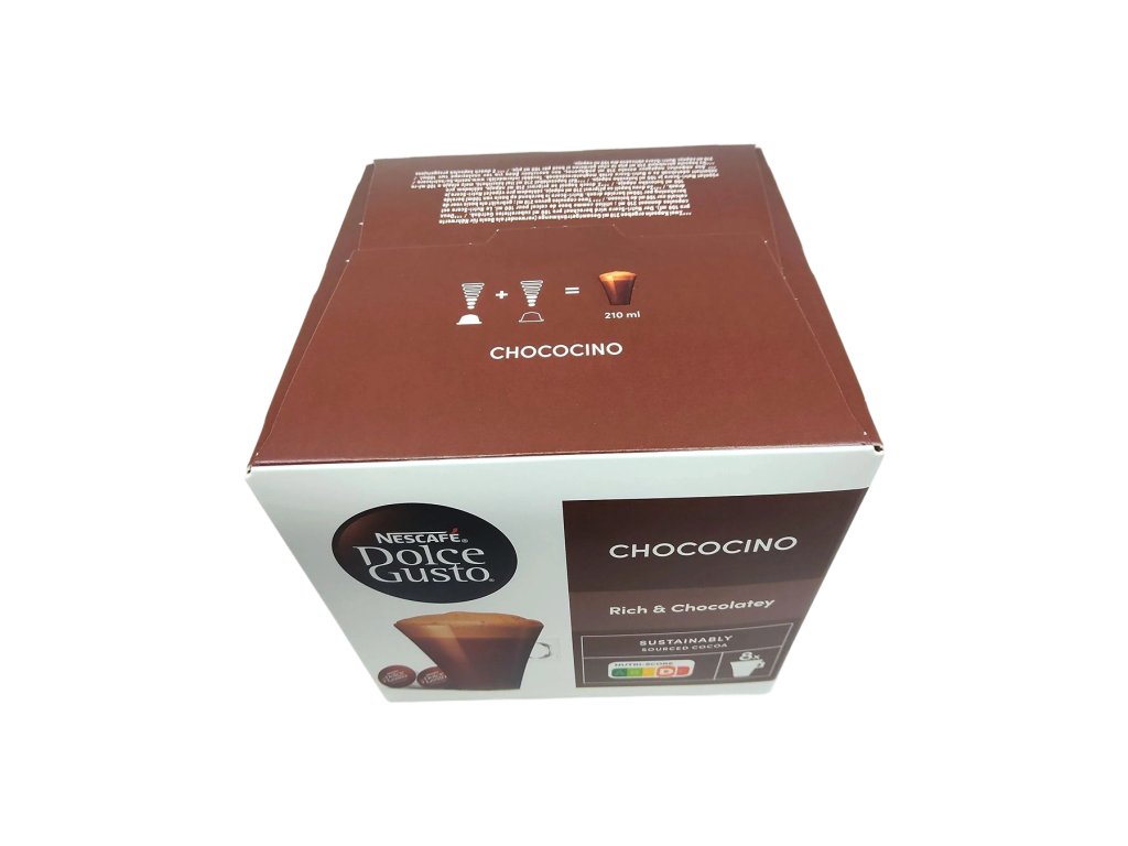 Každé balení obsahuje 8 kapslí čokolády a 8 kapslí mléka, navržených speciálně pro kávovary NESCAFÉ Dolce Gusto, takže si můžete připravit až 8 dokonalých šálků Chococina, vždy se stejnou intenzitou, chutí a vizuálním požitkem. Chococino je skvělou volbou pro všechny, kdo touží po rychlém, pohodlném a luxusním čokoládovém zážitku přímo z domova – každý šálek je malou oslavou lahodné chuti a pohodlí.