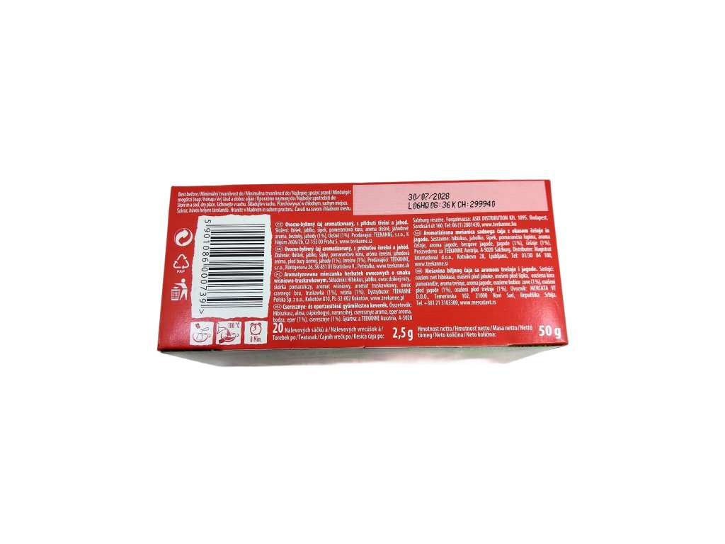 Složení: ibišek, jablko, šípky, pomerančová kůra, aroma třešní, jahodové aroma, plod černého bezu, jahody (1%), třešně (1%)