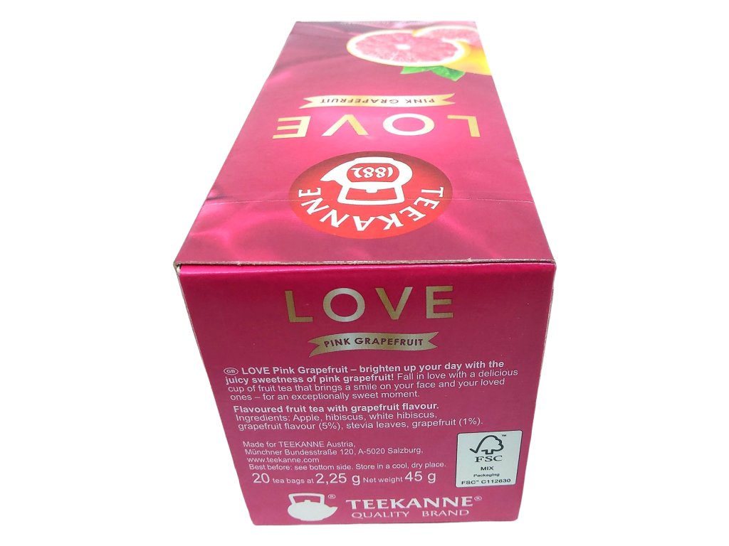 Čaj Teekanne Love Pink Grapefruit je jako osvěžující paprsek slunce ve vašem šálku – plný barvy, vůně a šťavnatého ovocného pohlazení. Tato směs v sobě spojuje jedinečnou chuť růžového grapefruitu, která je dokonale vyvážena mezi svěží kyselostí a jemnou sladkostí. Už při prvním nádechu vás okouzlí ovocné aroma, které vás zavede do světa letních zahrad plných citrusových plodů a dobré nálady.